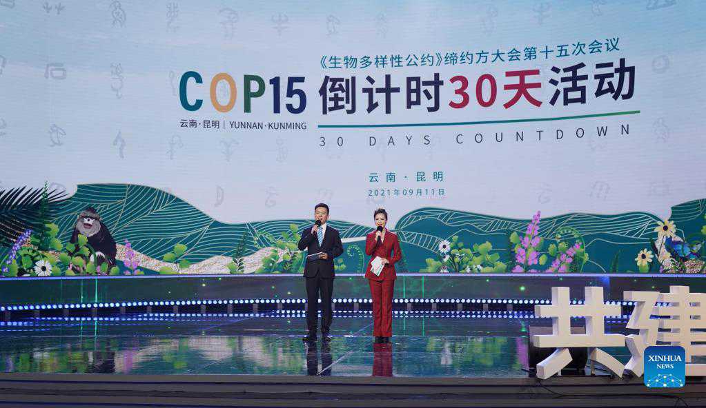 Photo taken on Sept. 11, 2021 shows the 30 days countdown ceremony of the 15th meeting of the Conference of the Parties to the UN Convention on Biological Diversity (COP15) in Kunming, southwest China's Yunnan Province. The meeting, which is set to kick off in Kunming on Oct. 11, will review the "post-2020 global biodiversity framework" to draw a blueprint for biodiversity conservation in the future. (Photo by Liang Zhiqiang/Xinhua)