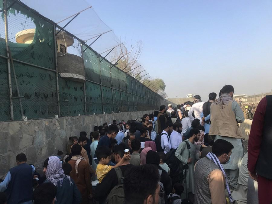 Afghans gather near a gate of Kabul airport in Kabul, Afghanistan, Aug. 22, 2021. (Xinhua/Rahmatullah Alizadah)