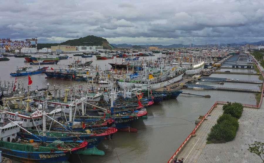 Aerial photo taken on Sept. 12, 2021 shows fishing boats docking at Shenjiamen fishing port in Zhoushan, east China's Zhejiang Province. (Photo by Zhang Lei/Xinhua)