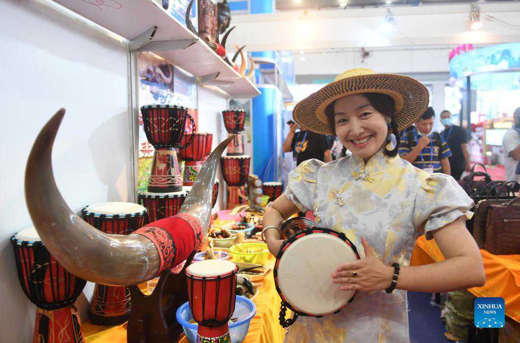 A woman plays the drum at the booth of Ghana during the 18th China-ASEAN Expo in Nanning, capital of south China's Guangxi Zhuang Autonomous Region, Sept. 12, 2021. The 18th China-ASEAN Expo and China-ASEAN Business and Investment Summit kicked off Friday in Nanning, highlighting the building of a closer China-ASEAN community with a shared future. This year's expo continues to set "Belt and Road" International Pavilion for countries outside ASEAN, with about 120 enterprises from 30 countries participating in the expo. (Xinhua/Lu Boan)
