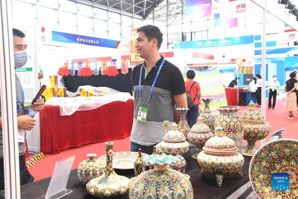 An exhibitor introduces Iranian artworks during the 18th China-ASEAN Expo in Nanning, capital of south China's Guangxi Zhuang Autonomous Region, Sept. 12, 2021. The 18th China-ASEAN Expo and China-ASEAN Business and Investment Summit kicked off Friday in Nanning, highlighting the building of a closer China-ASEAN community with a shared future. This year's expo continues to set "Belt and Road" International Pavilion for countries outside ASEAN, with about 120 enterprises from 30 countries participating in the expo. (Xinhua/Zhou Hua)