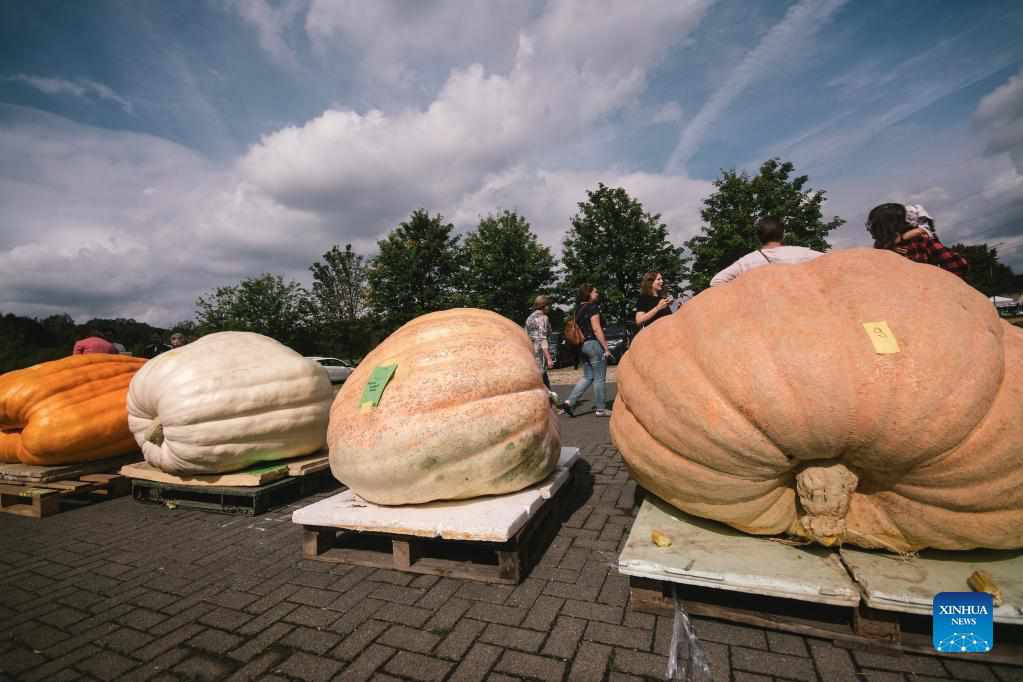 Giant pumpkins are seen during a traditional pumpkin festival in Lohmar, a town near Cologne, Germany, on Sept. 12, 2021. (Photo by Tang Ying/Xinhua)