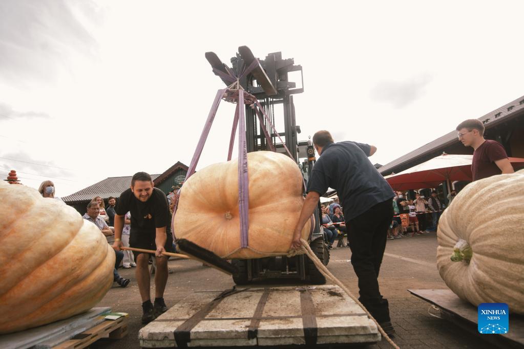 Staff members use a forklift to weigh a pumpkin during a traditional pumpkin festival in Lohmar, a town near Cologne, Germany, on Sept. 12, 2021. (Photo by Tang Ying/Xinhua)
