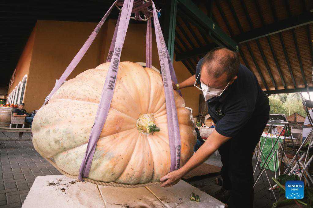 A staff member weighs a pumpkin during a traditional pumpkin festival in Lohmar, a town near Cologne, Germany, on Sept. 12, 2021. (Photo by Tang Ying/Xinhua)