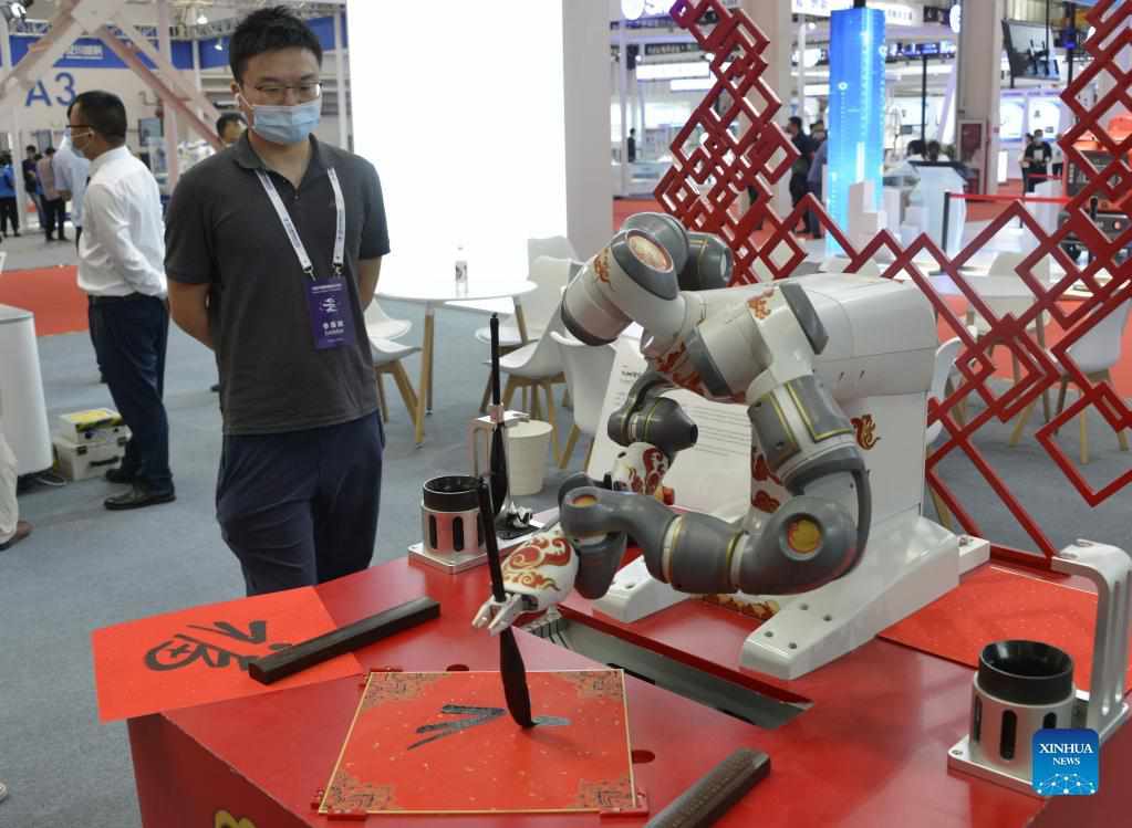 Photo taken on Sept. 10, 2021 shows a robot writing calligraphy at the World Robot Conference held in Beijing, capital of China. The 2021 World Robot Conference is held in Beijing from Sept. 10 to 13. More than 110 enterprises and scientific research institutions brought over 500 products to the exhibition. (Xinhua/Li Xin)