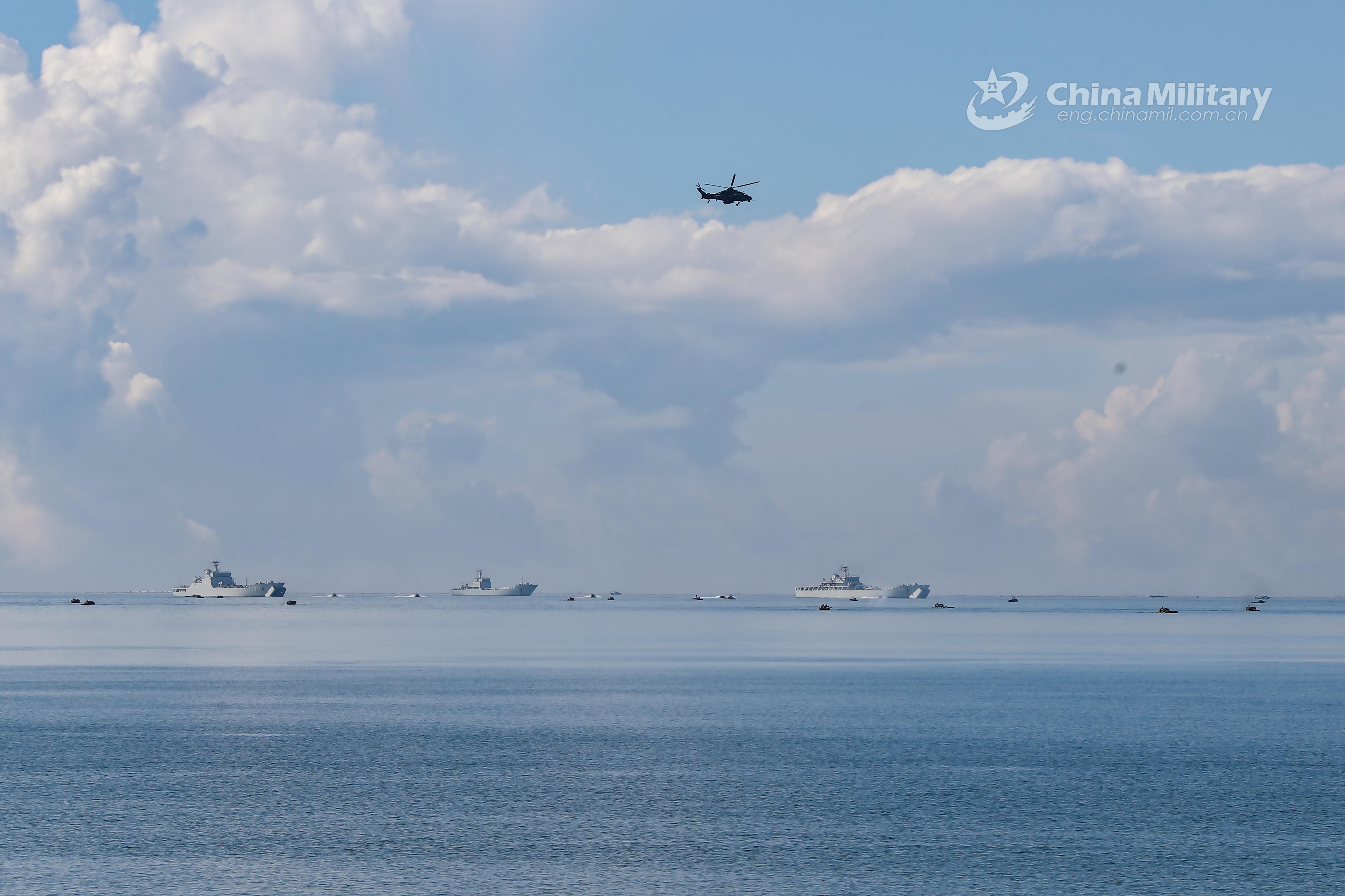 The military helicopters and amphibious assault vehicles attached to a brigade of the army under the PLA Eastern Theater Command conduct coordination in a maritime training exercise on September 4, 2021. (eng.chinamil.com.cn/Photo by Xie Wenjian)