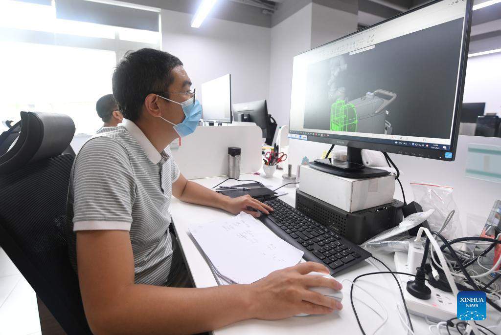 Staff members of Tinavi, a Chinese tech company that specializes in the development of orthopedic surgical robots, work in Beijing, capital of China, Aug. 4, 2021. The orthopedic surgical robot could dynamically analyze the patient's anatomy as well as the spine-hip relation and carry out the individualized surgery planning exactly as planned. Beijing Haidian Hospital officially introduced orthopedic surgery robots from May 2020, and has completed more than 400 robotic surgeries by the end of August 2021. (Xinhua/Ren Chao)