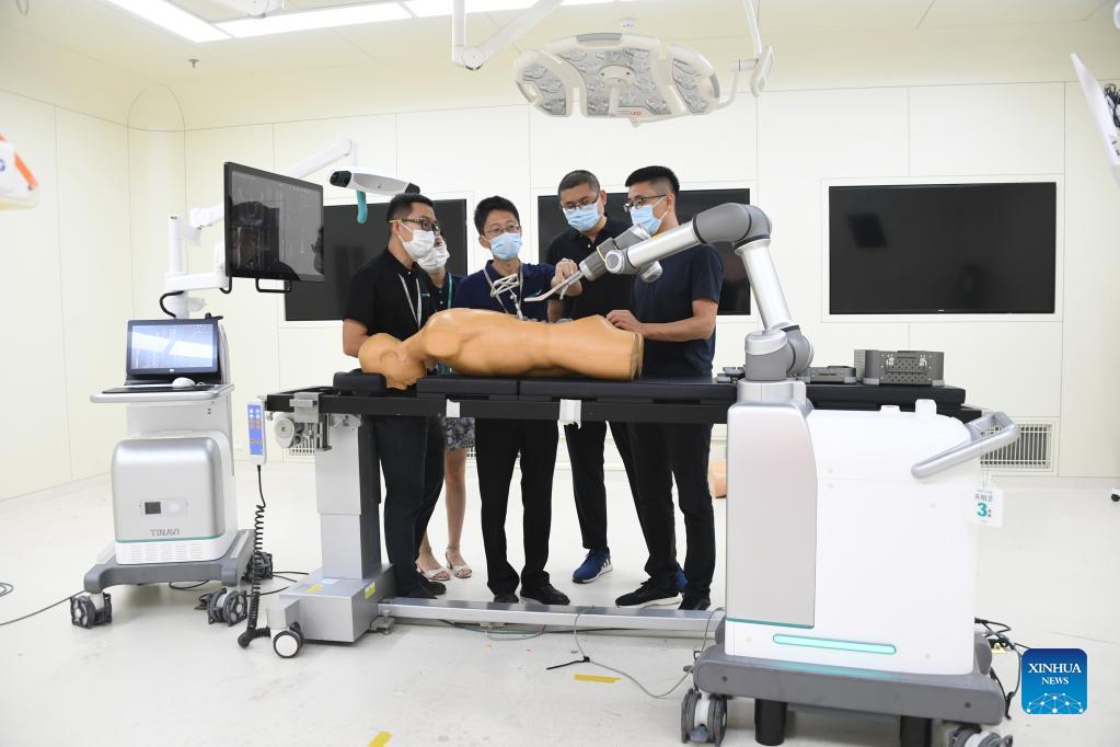 Liu Tiechang (3rd R) and his colleagues of Tinavi, a Chinese tech company that specializes in the development of orthopedic surgical robots, work in a lab in Beijing, capital of China, Aug. 4, 2021. The orthopedic surgical robot could dynamically analyze the patient's anatomy as well as the spine-hip relation and carry out the individualized surgery planning exactly as planned. Beijing Haidian Hospital officially introduced orthopedic surgery robots from May 2020, and has completed more than 400 robotic surgeries by the end of August 2021. (Xinhua/Ren Chao)