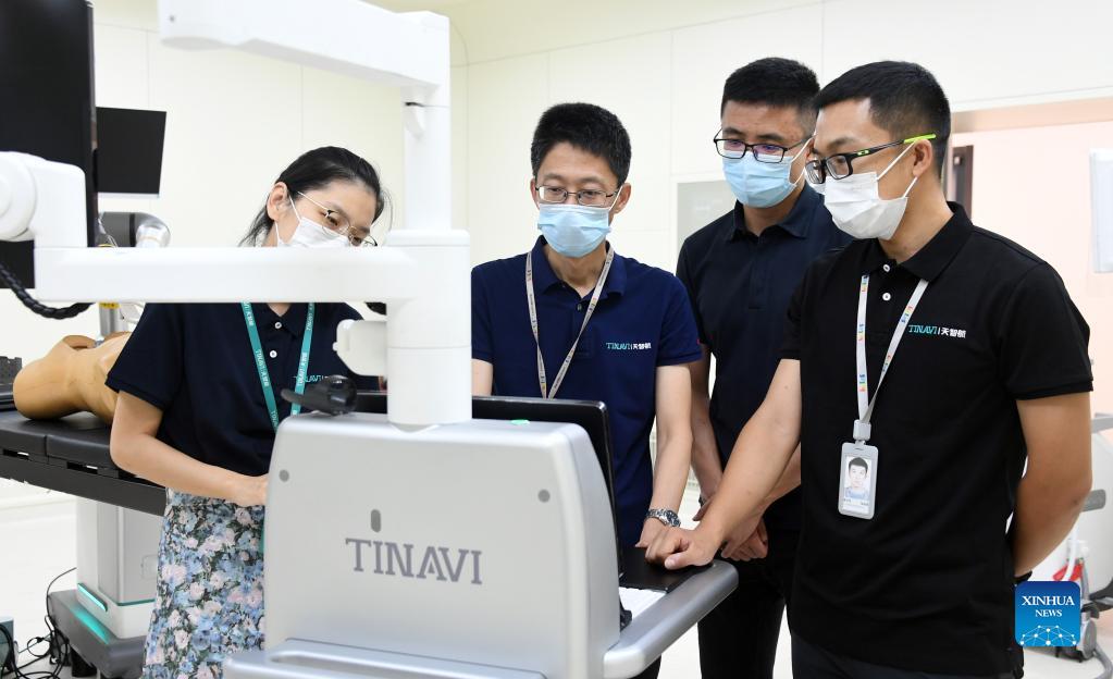 Liu Tiechang (2nd L) and his colleagues of Tinavi, a Chinese tech company that specializes in the development of orthopedic surgical robots, work in a lab in Beijing, capital of China, Aug. 4, 2021. The orthopedic surgical robot could dynamically analyze the patient's anatomy as well as the spine-hip relation and carry out the individualized surgery planning exactly as planned. Beijing Haidian Hospital officially introduced orthopedic surgery robots from May 2020, and has completed more than 400 robotic surgeries by the end of August 2021. (Xinhua/Ren Chao)