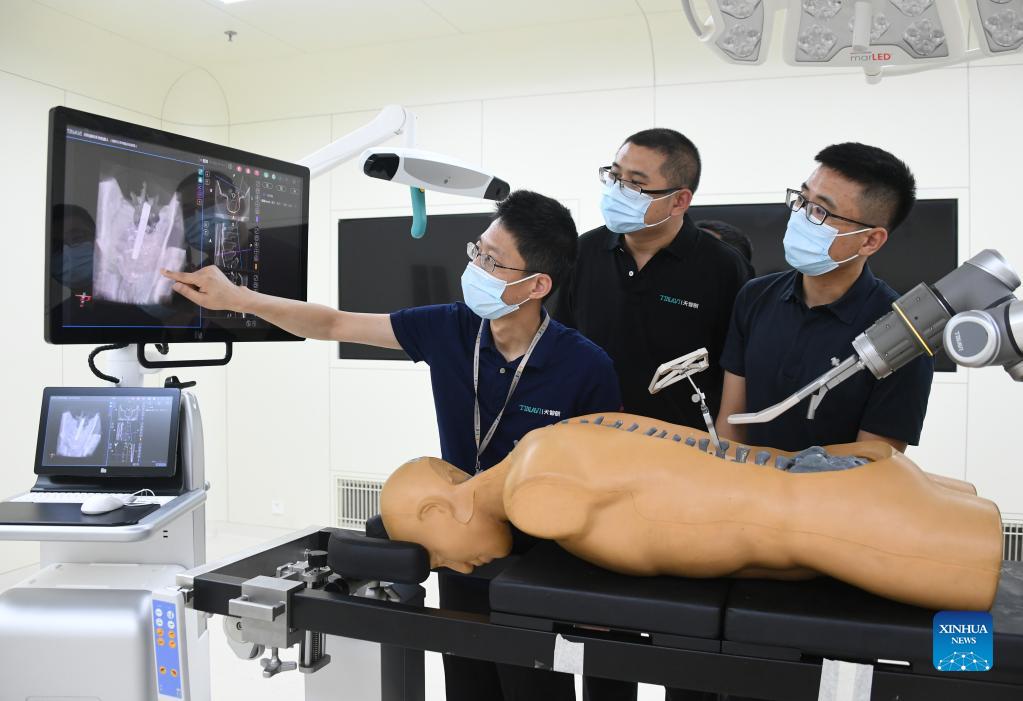 Liu Tiechang (1st L) and his colleagues of Tinavi, a Chinese tech company that specializes in the development of orthopedic surgical robots, work in a lab in Beijing, capital of China, Aug. 4, 2021. The orthopedic surgical robot could dynamically analyze the patient's anatomy as well as the spine-hip relation and carry out the individualized surgery planning exactly as planned. Beijing Haidian Hospital officially introduced orthopedic surgery robots from May 2020, and has completed more than 400 robotic surgeries by the end of August 2021. (Xinhua/Ren Chao)