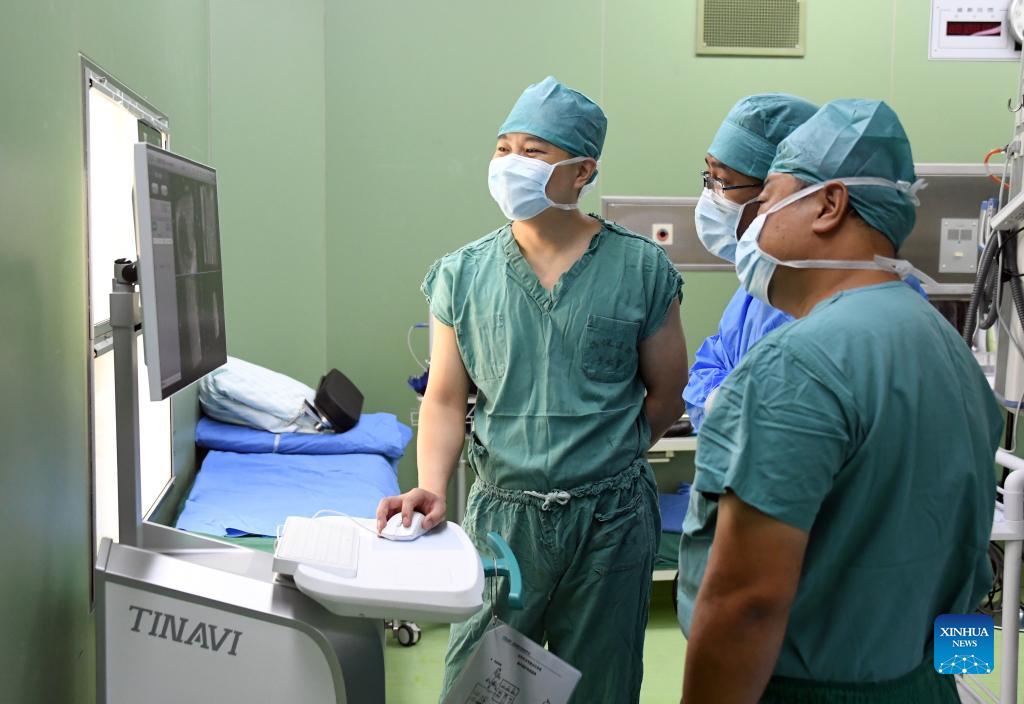 Doctors make a surgical plan based on the information provided by orthopedic surgical robot in Haidian Hospital, in Beijing, capital of China, Aug. 3, 2021. The orthopedic surgical robot could dynamically analyze the patient's anatomy as well as the spine-hip relation and carry out the individualized surgery planning exactly as planned. Beijing Haidian Hospital officially introduced orthopedic surgery robots from May 2020, and has completed more than 400 robotic surgeries by the end of August 2021. (Xinhua/Ren Chao)