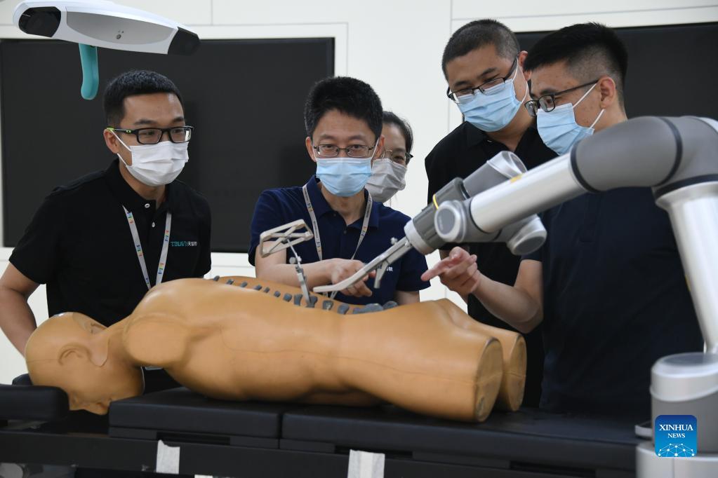 Liu Tiechang (2nd L) and his colleagues of Tinavi, a Chinese tech company that specializes in the development of orthopedic surgical robots, work in a lab in Beijing, capital of China, Aug. 4, 2021. The orthopedic surgical robot could dynamically analyze the patient's anatomy as well as the spine-hip relation and carry out the individualized surgery planning exactly as planned. Beijing Haidian Hospital officially introduced orthopedic surgery robots from May 2020, and has completed more than 400 robotic surgeries by the end of August 2021. (Xinhua/Ren Chao)
