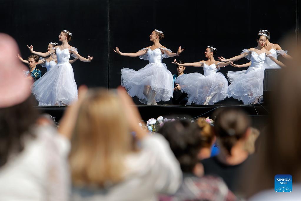 Ballet students perform on a stage in front of Bucharest's National Opera hall during the Dance Gala project - childhood in dance steps, in downtown Bucharest, Romania, Sept. 12, 2021. (Photo by Cristian Cristel/Xinhua)