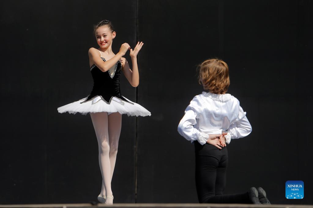Ballet students perform on a stage in front of Bucharest's National Opera hall during the Dance Gala project - childhood in dance steps, in downtown Bucharest, Romania, Sept. 12, 2021. (Photo by Cristian Cristel/Xinhua)