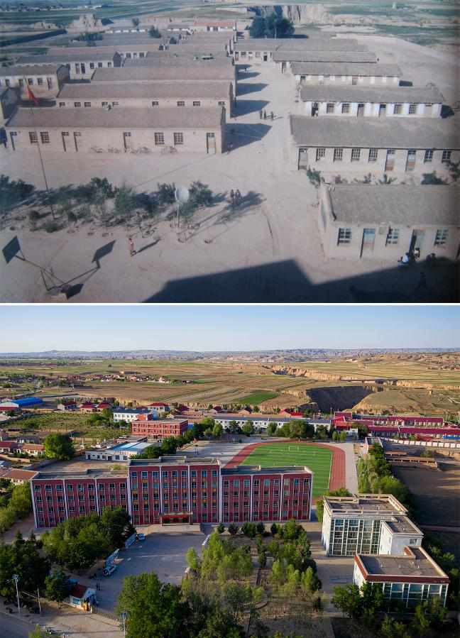 Combo photo shows the offices and meeting rooms of Tongxin No. 3 Middle School in March 2000 (top, file photo) and aerial view of the teaching building of Tongxin No. 3 Middle School on June 21, 2021 (bottom, taken by Yang Zhisen), in Yuwang Township of Tongxin County, northwest China's Ningxia Hui Autonomous Region. (Xinhua)