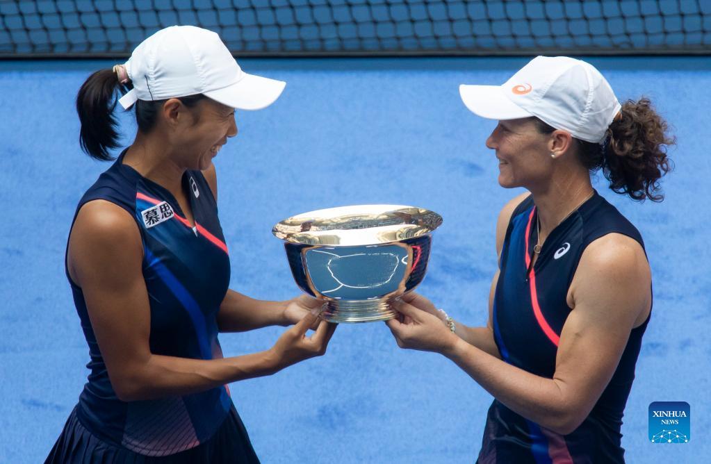 Zhang Shuai (L)/Samantha Stosur are seen during the awarding ceremony after the women's doubles final between Zhang Shuai of China/Samantha Stosur of Australia and Coco Gauff/Catherine McNally of the United States at the 2021 US Open in New York, the United States, Sept. 12, 2021. (Photo by Michael Nagle/Xinhua)