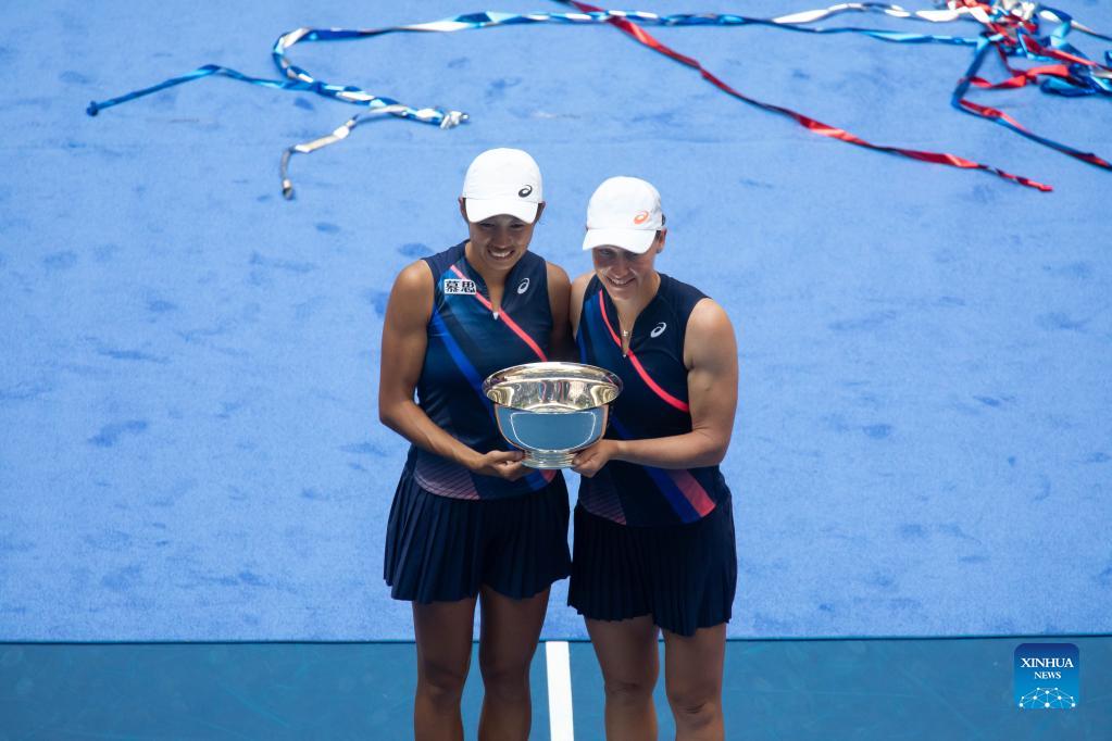 Zhang Shuai (L)/Samantha Stosur pose during the awarding ceremony after the women's doubles final between Zhang Shuai of China/Samantha Stosur of Australia and Coco Gauff/Catherine McNally of the United States at the 2021 US Open in New York, the United States, Sept. 12, 2021. (Photo by Michael Nagle/Xinhua)