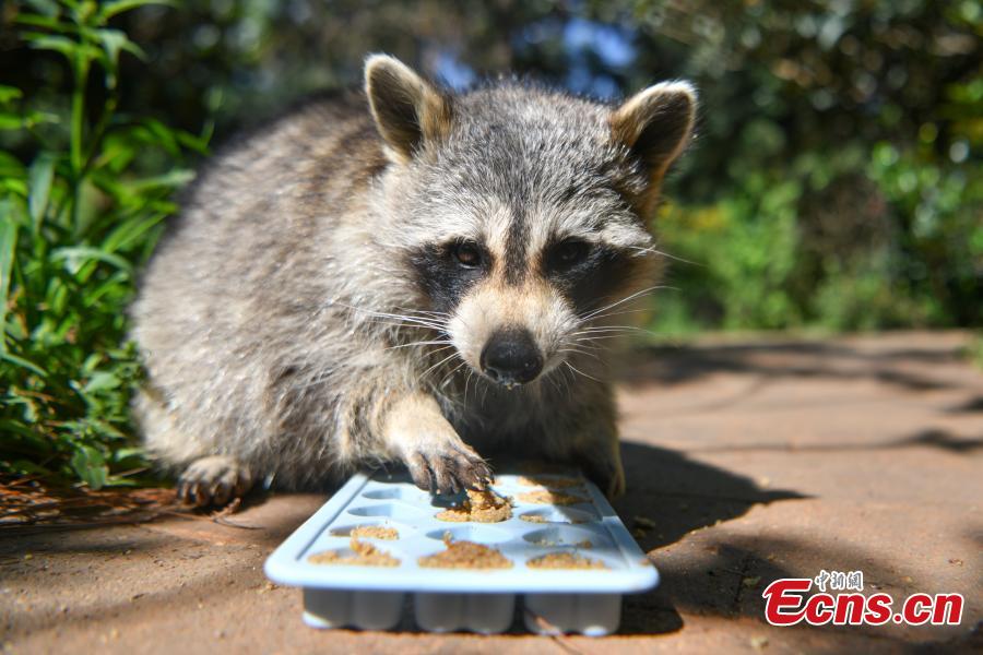 A raccoon enjoys special mooncakes at the Yunnan Safari Park in Kunming, capital of southwest China's Yunnan Province, September 12, 2021. (Photo: China News Service/Liu Ranyang)