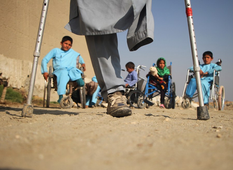 An Afghan disabled child walks with crutches in Surkh Rod district of Nangarhar province, eastern Afghanistan, Feb. 22, 2020. (Photo by Saifurahman Safi/Xinhua)