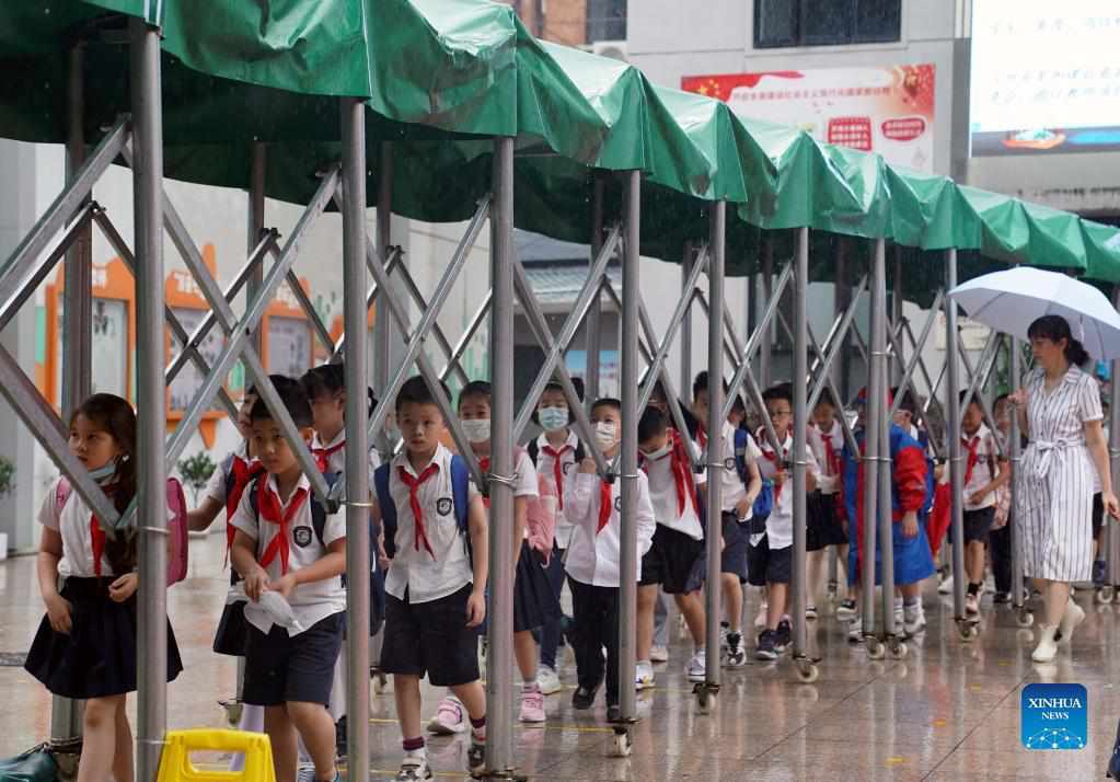 Students line up under the shelter of a removable awning after class at a primary school in Huangpu District, east China's Shanghai, Sept. 13, 2021. Shanghai has ordered kindergartens, primary and high schools to suspend classes from Monday afternoon to Tuesday as the city braces for heavy rains and strong winds due to Typhoon Chanthu. (Xinhua/Liu Ying)