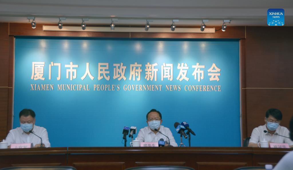 A press conference on the COVID-19 prevention and control is held in Xiamen, southeast China's Fujian Province, Sept. 13, 2021. Xiamen reported 12 locally transmitted confirmed COVID-19 cases from Sunday to 6 p.m. Monday. All the cases are under treatment at a designated hospital and in stable condition. To stem the spread of the coronavirus, the city is reducing personnel flows and gatherings, speeding up epidemiological investigations, and conducting nucleic acid testing to screen for infections. (Xinhua/Yan Zhihong)