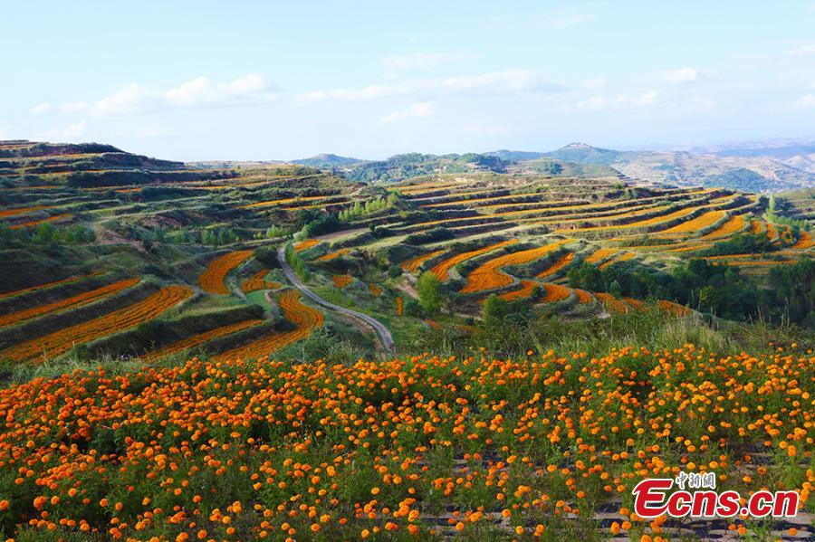 Undated photo shows a view of marigold flower fields in Songshu Town of Qingshui County, northwest China's Gansu Province. (Photo: China News Service/Wang Weidong)