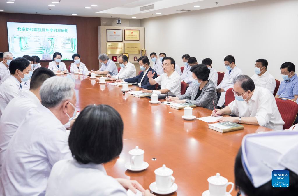 Chinese Premier Li Keqiang, also a member of the Standing Committee of the Political Bureau of the Communist Party of China (CPC) Central Committee, convenes a seminar with medical experts and listens to their advice on the development and innovation of the healthcare sector during his inspection to Peking Union Medical College Hospital (PUMCH) in Beijing, capital of China, Sept. 13, 2021. (Xinhua/Wang Ye)