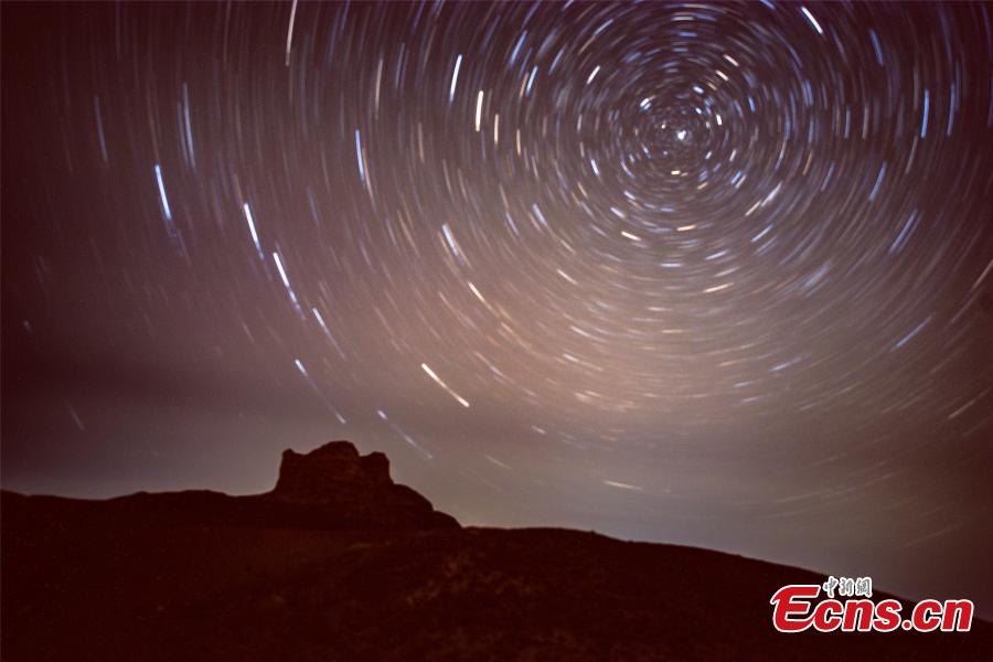 Time-lapse photo shows the starry night sky over the Yangguan Pass in Dunhuang, Northwest China's Gansu Province. (Photo: China News Service/Wang Binyin)