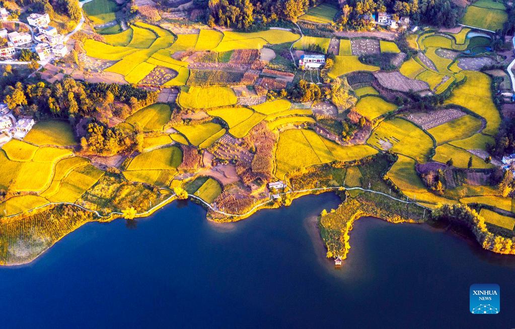 Aerial photo taken on Sept. 11, 2021 shows paddy fields in Dahaizi Village of Lyvhua Township, Qianxi City, southwest China's Guizhou Province. (Photo by Fan Hui/Xinhua)