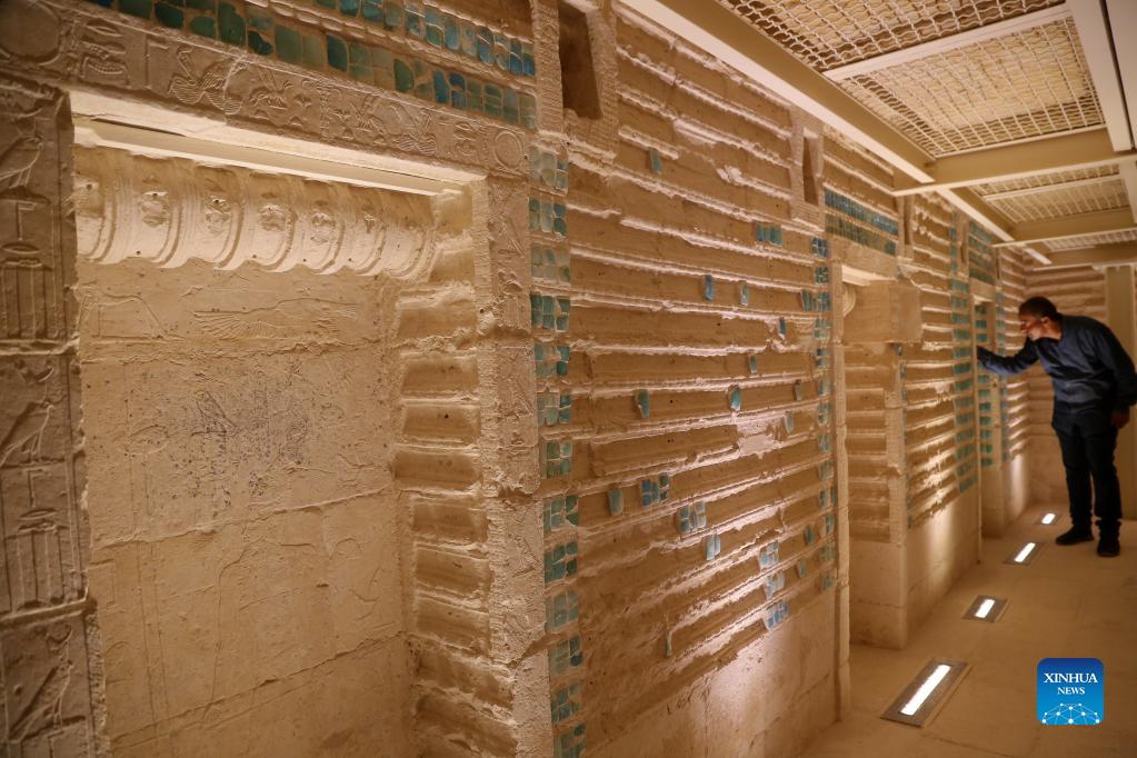Photo shows the relief inside the south tomb of King Djoser in Saqqara necropolis, south of Cairo, Egypt, on Sept. 14, 2021. Egypt on Monday opened the south tomb of King Djoser after restoration in Saqqara necropolis near the capital Cairo. The restoration process started in 2006 and involved conservation and restoration work of the lower corridors, strengthening the walls and ceilings, complete the interior inscriptions in the tomb as reassembling the granite sarcophagus. (Photo by Mohamed Asad/Xinhua)