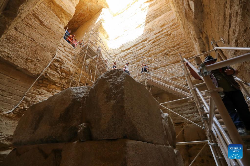 Tourists visit the south tomb of King Djoser in Saqqara necropolis, south of Cairo, Egypt, on Sept. 14, 2021. Egypt on Monday opened the south tomb of King Djoser after restoration in Saqqara necropolis near the capital Cairo. The restoration process started in 2006 and involved conservation and restoration work of the lower corridors, strengthening the walls and ceilings, complete the interior inscriptions in the tomb as reassembling the granite sarcophagus. (Xinhua/Sui Xiankai)