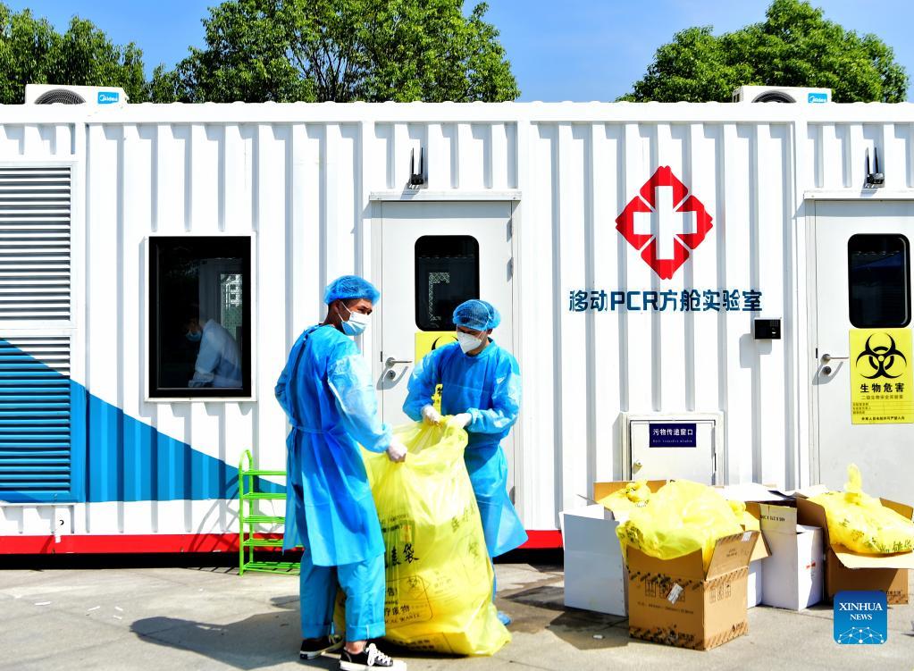 Staff members dispose medical waste outside a PCR (polymerase chain reaction) lab for nucleic acid testing in Xianyou County, southeast China's Fujian Province, Sept. 14, 2021. Three PCR labs have been built in the county to boost nucleic acid detection capacity. (Xinhua/Wei Peiquan)