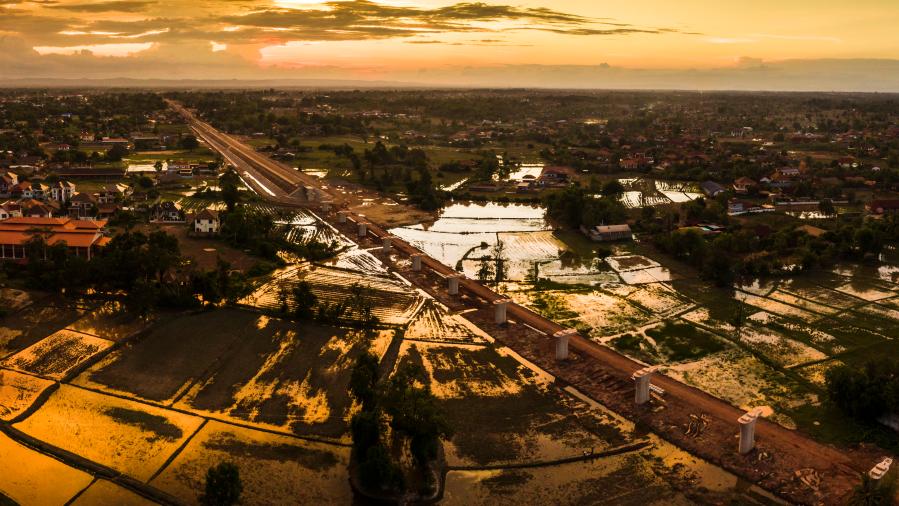 Aerial photo taken on May 29, 2020, shows a view of the under-construction China-Laos Railway running through the outskirts of the Lao capital Vientiane. (Xinhua/Pan Longzhu)