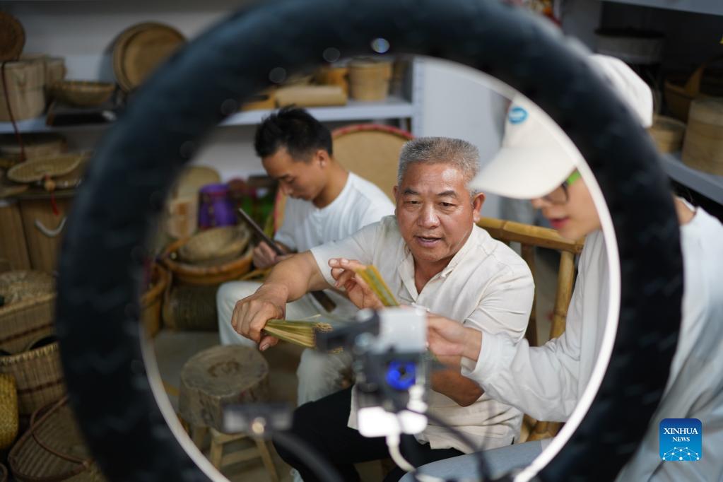 Li Nian'gen (C) and his team introduce bamboo products via livestreaming in Dongcun Township, Fenyi County, Xinyu City of east China's Jiangxi Province, Sept. 1, 2021. Li Nian'gen, 62, is the fifth-generation inheritor of bamboo-weaving techniques in Dongcun Township. Li acquired bamboo-weaving techniques from his uncle when he was barely nine years old, and started to make a living on his own at the age of 15. More than 20 of his apprentices chose to seek employment for better income in other walks of life away from home in early 1990s, but Li decided to stay and stick to his profession. Li occasionally demonstrated his bamboo-weaving techniques on a video clip platform as suggested by others in 2019, and became increasingly popular ever since then. Now Li has more than 8 million followers on different platforms, with his short videos popular among netizens. (Xinhua/Zhou Mi)