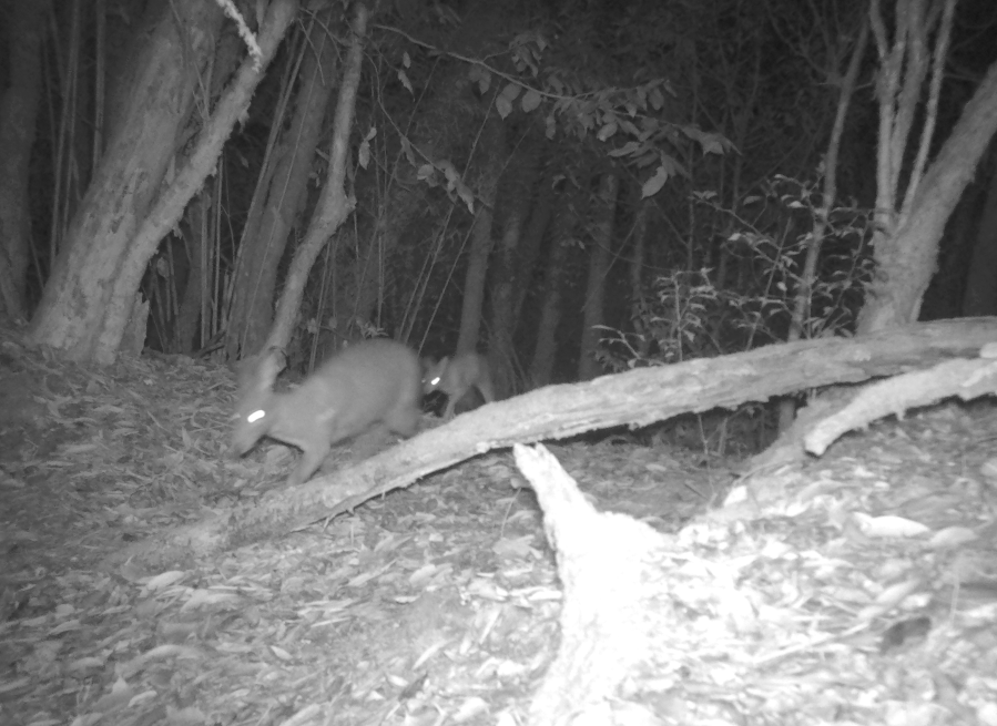 Photo provided by the local multimedia center in Changning County, southwest China's Yunnan Province shows the two endangered forest musk deer captured by an infrared camera in the Lancang River nature reserve on Aug. 5, 2021. (Changning Multimedia Center of Yunan/Handout via Xinhua)