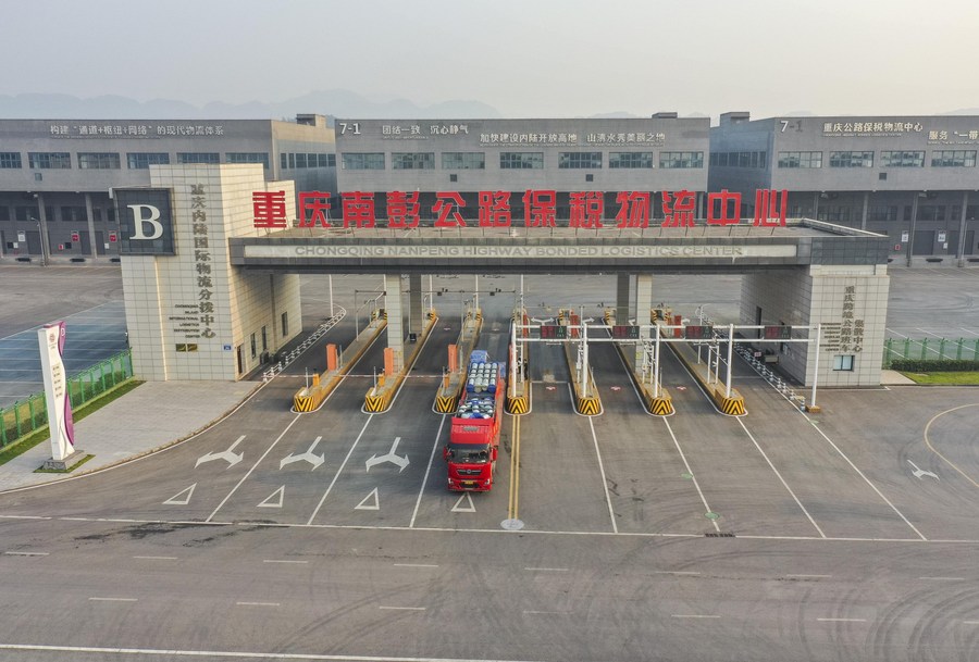 Aerial photo taken on Nov. 17, 2020 shows a cross-border highway regular lorry for Kazakhstan leaving the Nanpeng Highway Bonded Logistics Center in southwest China's Chongqing Municipality. (Xinhua/Huang Wei)