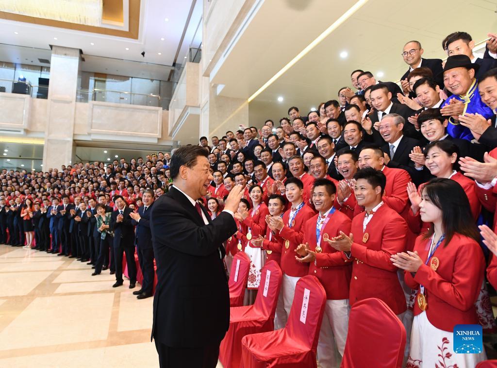 Chinese President Xi Jinping, also general secretary of the Communist Party of China Central Committee and chairman of the Central Military Commission, meets with individuals and groups who are advancing China's sporting cause, both professionals and amateurs, as well as representatives of athletes and coaches from the Chinese Olympic delegation for Tokyo 2020 Olympic Games, in Xi'an, capital city of northwest China's Shaanxi Province, Sept. 15, 2021. (Xinhua/Yan Yan)