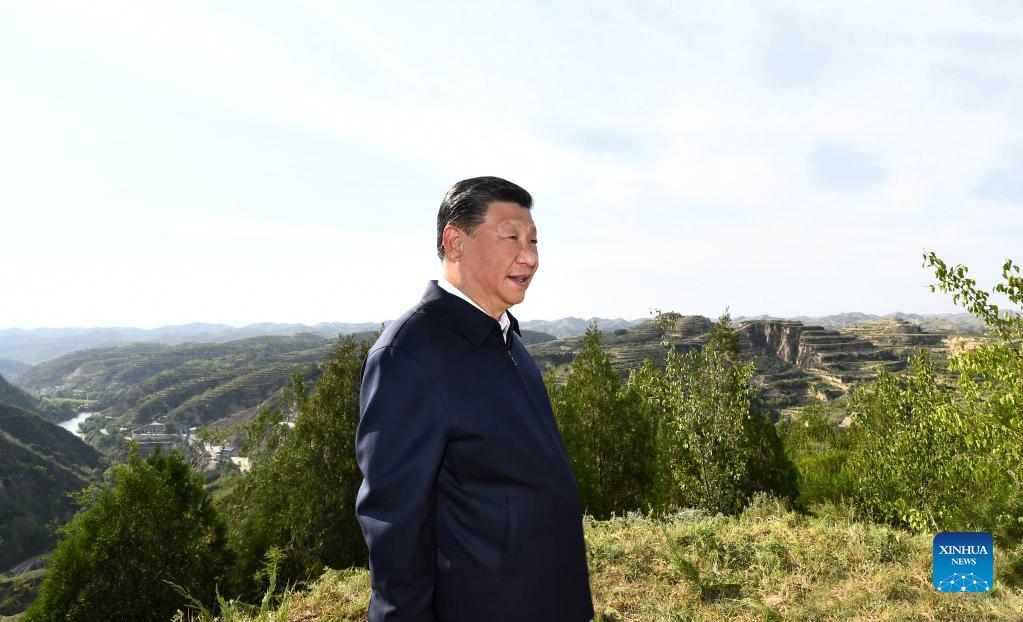 Chinese President Xi Jinping, also general secretary of the Communist Party of China Central Committee and chairman of the Central Military Commission, visits Gaoxigou Village in Mizhi County during his inspection tour of Yulin City in northwest China's Shaanxi Province, Sept. 13, 2021, learning about the progress in controlling soil erosion and advancing ecological conservation. (Xinhua/Xie Huanchi)