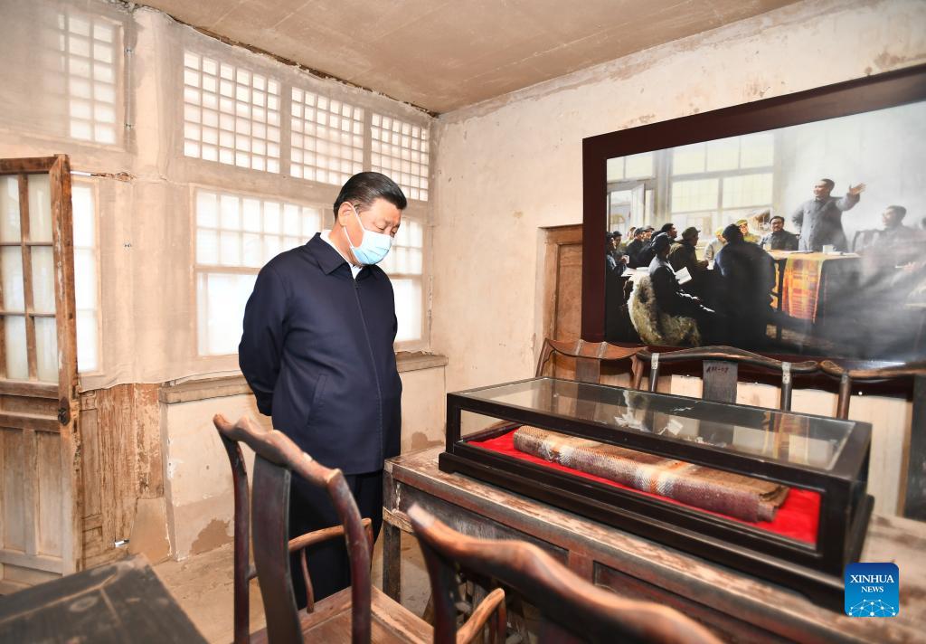 Chinese President Xi Jinping, also general secretary of the Communist Party of China Central Committee and chairman of the Central Military Commission, visits Yangjiagou revolutionary site in Mizhi County during his inspection tour of Yulin City in northwest China's Shaanxi Province, Sept. 13, 2021, learning about the progress in strengthening the protection of revolutionary sites, as well as sustaining revolutionary legacy. (Xinhua/Xie Huanchi)