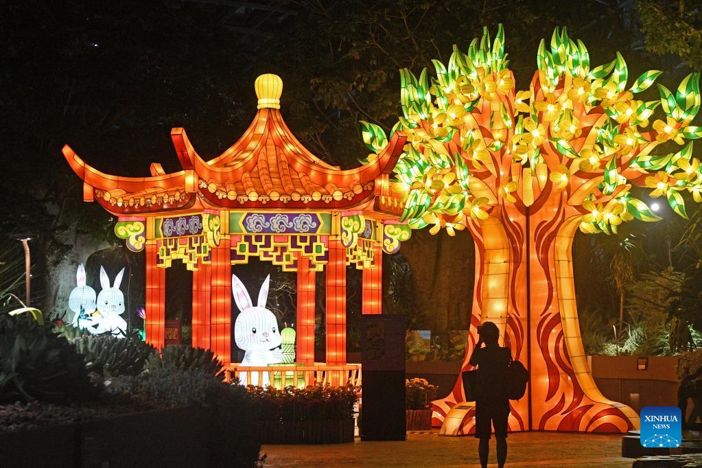 A visitor takes photos at an event to greet the coming Mid-Autumn Festival at Singapore's Gardens by the Bay on Sept. 15, 2021. (Xinhua/Then Chih Wey)