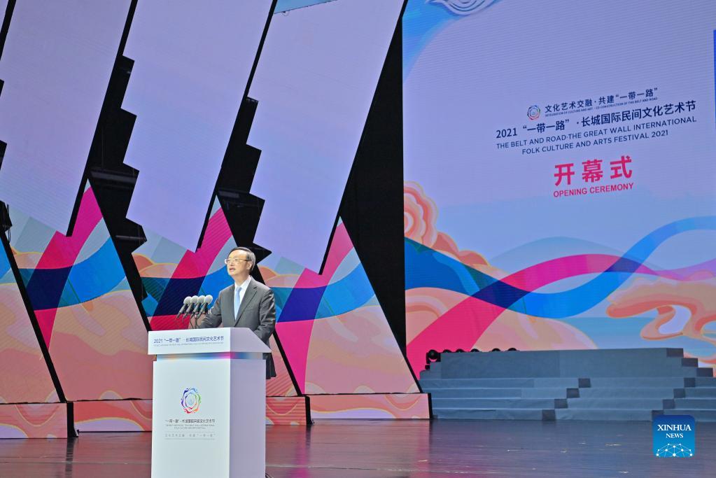 Yang Jiechi, a member of the Political Bureau of the Central Committee of the Communist Party of China (CPC) and director of the Office of the Foreign Affairs Commission of the CPC Central Committee, attends the opening ceremony of The Belt And Road - The Great Wall International Folk Culture and Arts Festival in Langfang, north China's Hebei Province, Sept. 15, 2021. Yang also met with envoys of relevant countries to China and representatives of international organizations. (Xinhua/Yue Yuewei)