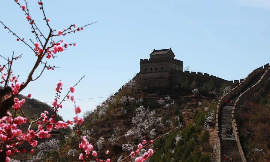 Photo taken on April 3, 2021 shows blooming flowers on Xiangshuihu section of the Great Wall in Huairou District, Beijing, capital of China. (Photo by Bu Xiangdong/Xinhua)