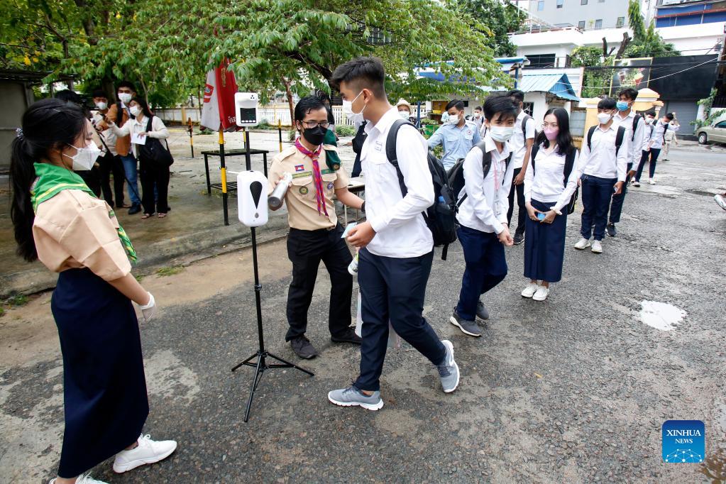 Students queue for body temperature screening at the Preah Sisowath High School in Phnom Penh, Cambodia, Sept. 15, 2021. Secondary and high schools in Cambodia reopened gradually on Wednesday after the majority of the population in the Southeast Asian nation have been vaccinated against COVID-19. (Photo by Sovannara/Xinhua)