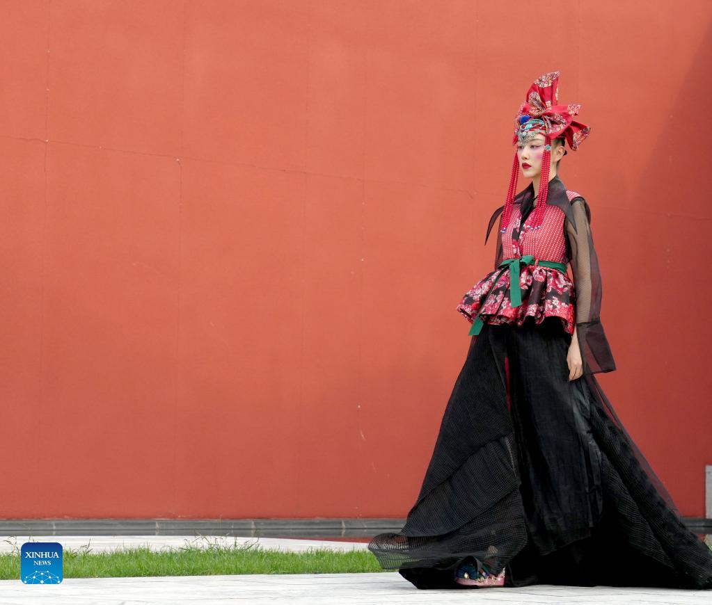 A model presents a creation designed by Zhang Yichao during the Beijing Fashion Week in Beijing, capital of China, Sept. 15, 2021. The 12-day event kicked off in Beijing on Wednesday. (Xinhua/Chen Jianli)