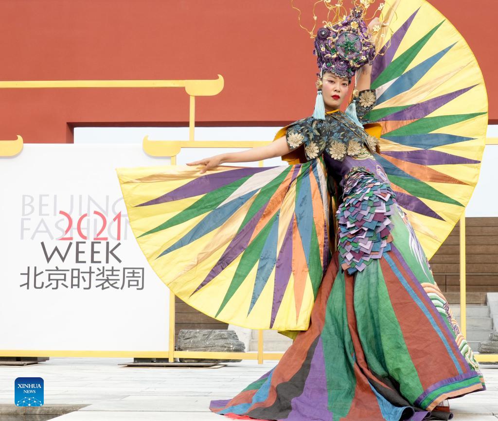 A model presents a creation designed by Zhang Yichao during the Beijing Fashion Week in Beijing, capital of China, Sept. 15, 2021. The 12-day event kicked off in Beijing on Wednesday. (Xinhua/Chen Jianli)