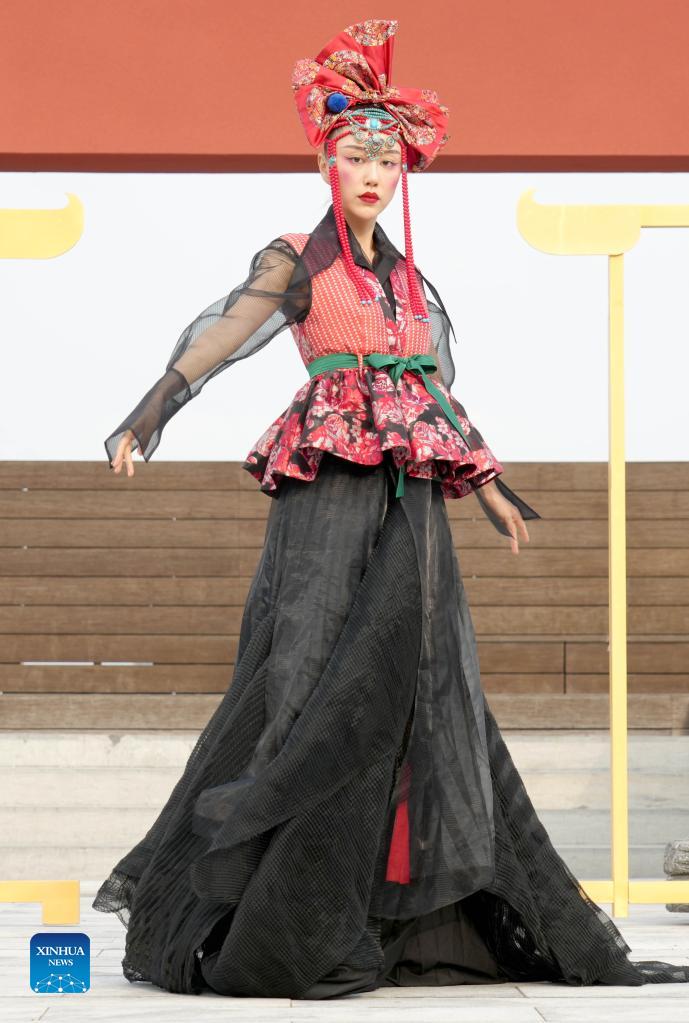 A model presents a creation designed by Zhang Yichao during the Beijing Fashion Week in Beijing, capital of China, Sept. 15, 2021. The 12-day event kicked off in Beijing on Wednesday. (Xinhua/Chen Jianli)