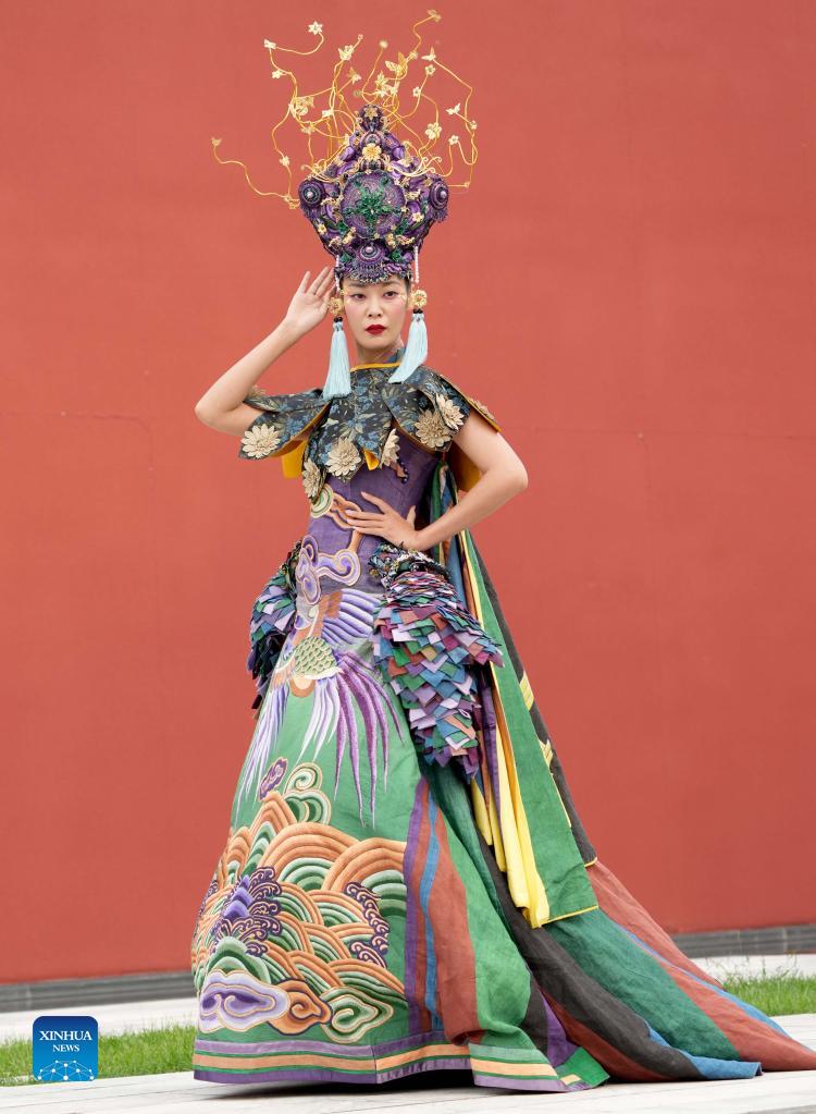 A model presents a creation designed by Zhang Yichao during the Beijing Fashion Week in Beijing, capital of China, Sept. 15, 2021. The 12-day event kicked off in Beijing on Wednesday. (Xinhua/Chen Jianli)
