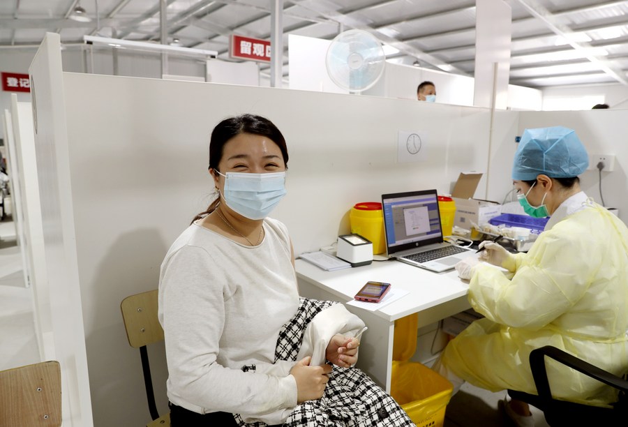 A Taiwan compatriot receives a dose of COVID-19 vaccine at Shanghai Guanghua Hospital of Integrated Traditional Chinese and Western Medicine in east China's Shanghai, April 19, 2021. (Xinhua/Liu Ying)