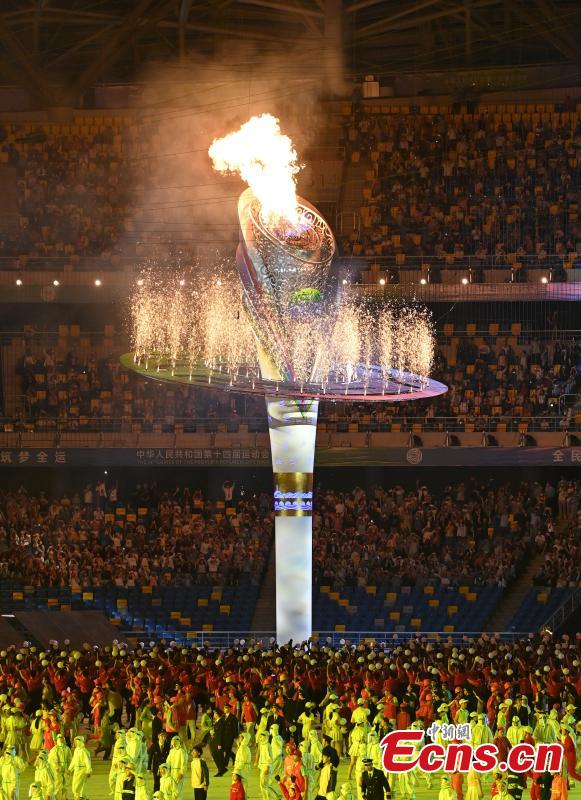 Photo taken on September 15, 2021 shows the cauldron of the 14th National Games is lit during the opening ceremony in Xi'an, Shaanxi Province. (Photo: China News Service/Hou Yu)