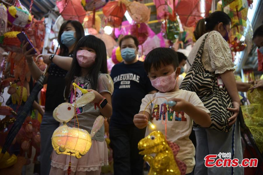 Children present lanterns they like at Tai Kiu Market in Yuen Long, Hong Kong Special Administrative Region. (Photo: China News Service/Li Zhihua)